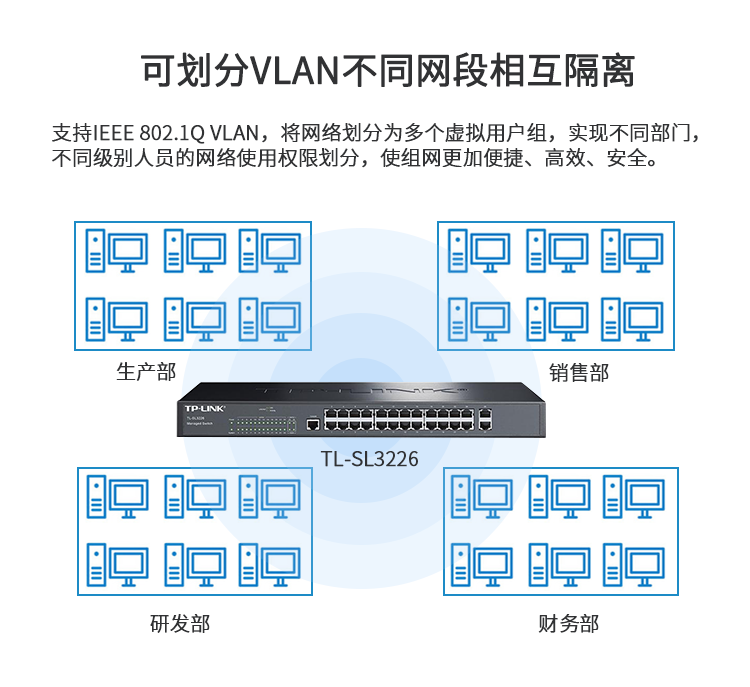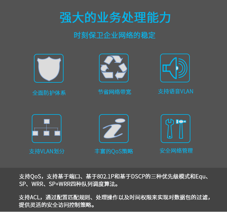 全面防護體系、節(jié)省網(wǎng)絡帶寬、支持語音VLAN、支持VLAN劃分、豐富的QoS策略、安全網(wǎng)絡管理。