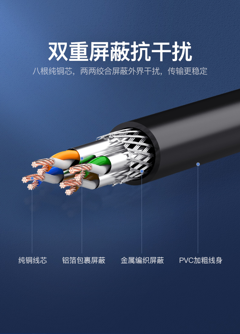 傳輸性能滿足并優(yōu)于六類標(biāo)準(zhǔn)。完全支持千兆以太網(wǎng)應(yīng)用,最高傳輸頻率350MHz,為未來應(yīng)用提供額外帶寬。中心為十字骨架隔離設(shè)計,增強了帶寬和網(wǎng)絡(luò)性能。導(dǎo)體采用23AWG優(yōu)質(zhì)無氧銅線(99.99%);采用鋁箔總屏蔽結(jié)構(gòu),改善線纜外部串?dāng)_及衰減;線纜成軸包裝,保護結(jié)構(gòu)穩(wěn)定。